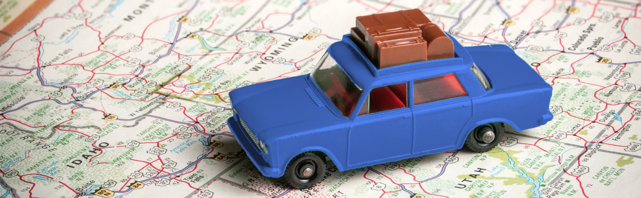 Vintage toy car with luggage on the roof with a road map of the U.S. Classic car elderly residents love